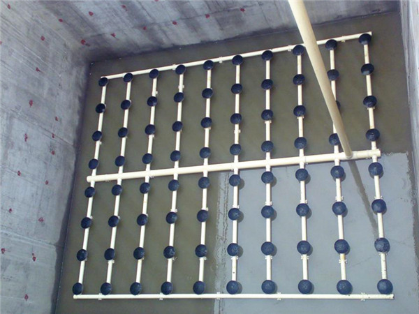曝气装置由曝气器、布气管道、三通、四通、弯头、调节器、连接件、清除装置等组成。布气管道按通常的环形布置,曝气器按供气量和池形布置密度,曝气器和布气管道的连接采用G3/4螺纹连接,底座为内螺纹(固定于布气管道上)曝气器为外螺纹,安装时先把调节器按所需尺寸用膨胀螺栓固定在池底,然后用抱箍把布气管道固定在调节器上,为防止其它作业如电焊火花和土建时,混凝土等重物 损坏曝气装置,必须等土建工程结束后在放水前把曝气器装上,为防止管道和连接部分漏气,应放水超过曝气器10cm左右底深度试漏,然后通气如发现有管道连接部分漏气应及时排除,然后正式投运。